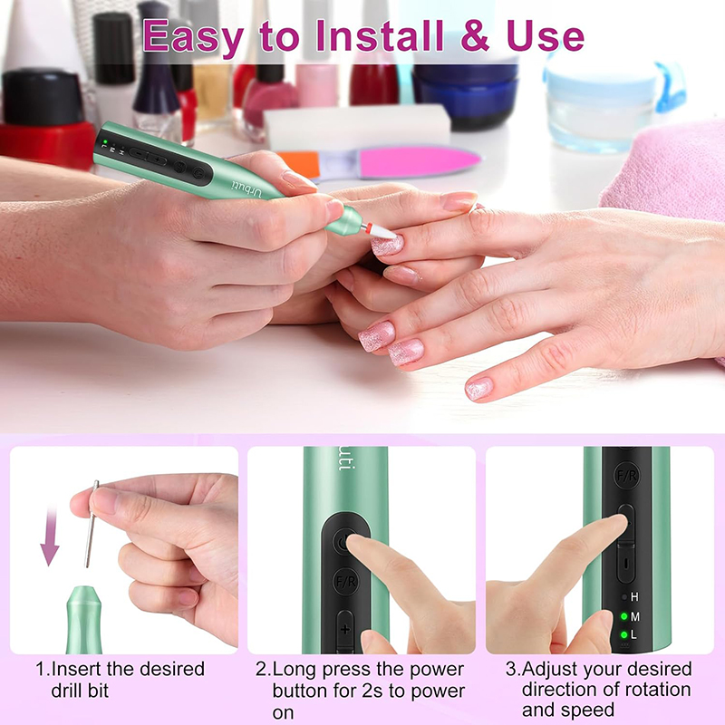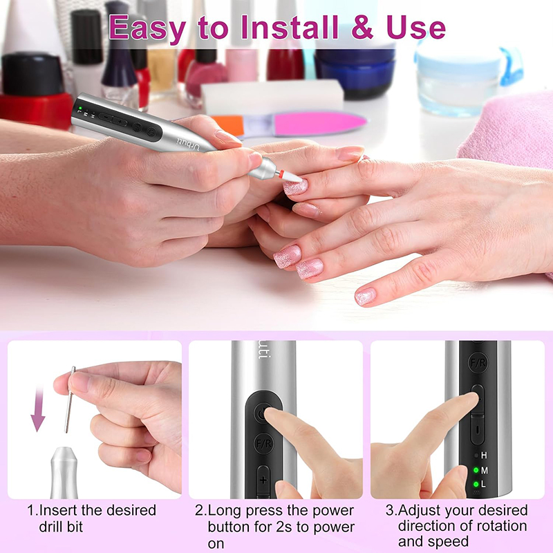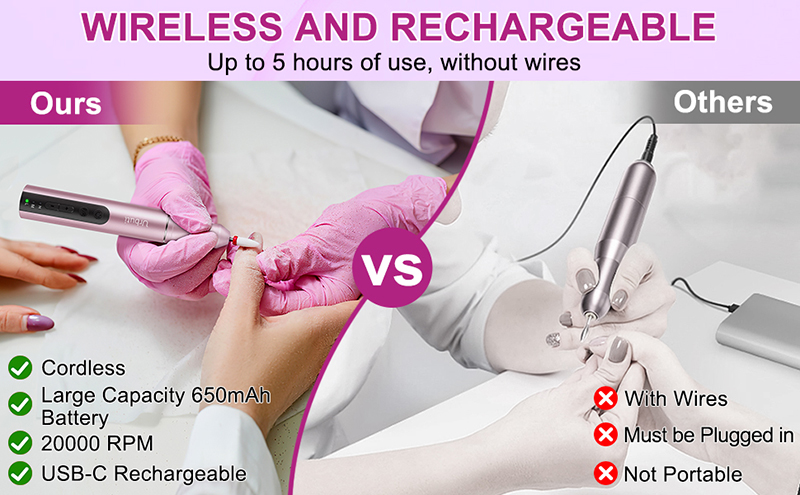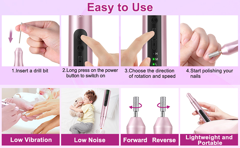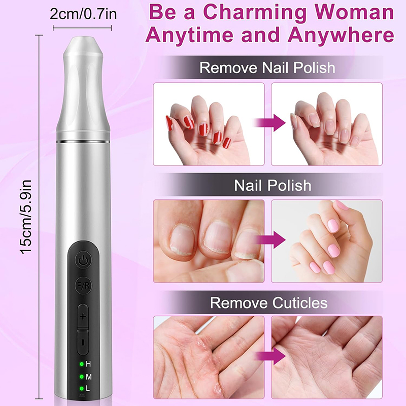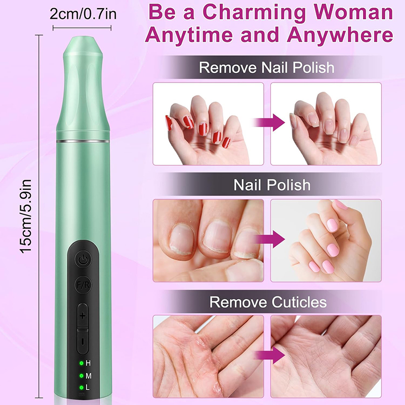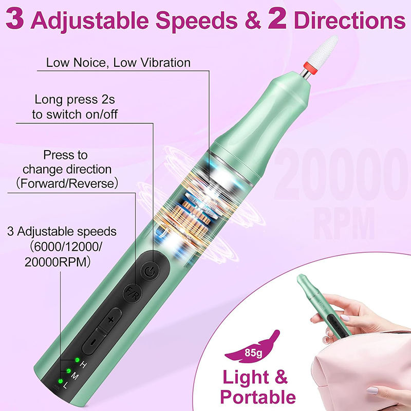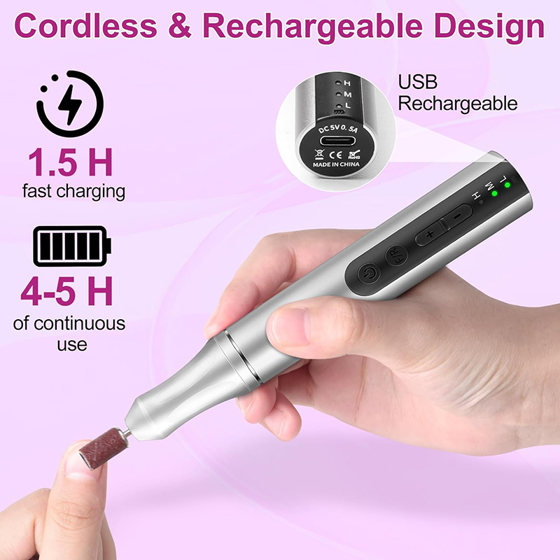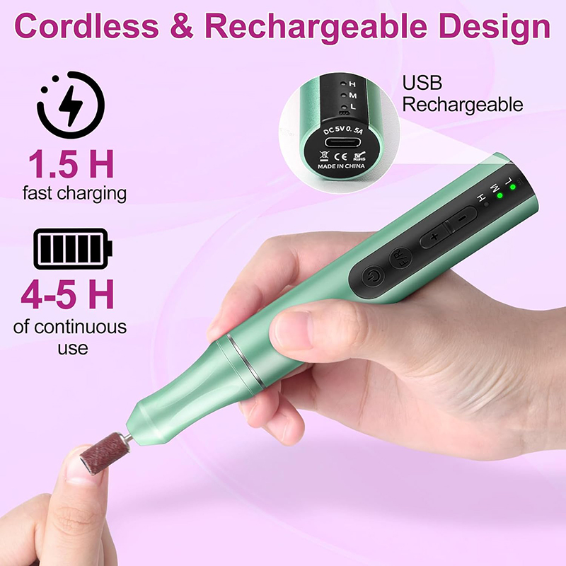 تم تصميم مثقاب الأظافر للأظافر الأكريليكية لتكون خفيفة الوزن (85 جم) ويمكن وضعها في محفظتك أو جيب ملابسك. كما يأتي مع كابل شحن USB يمكن توصيله بسهولة بأي جهاز USB للشحن، مما يجعله مناسبًا لك للاستمتاع بالعناية بأظافرك في أي وقت وفي أي مكان.