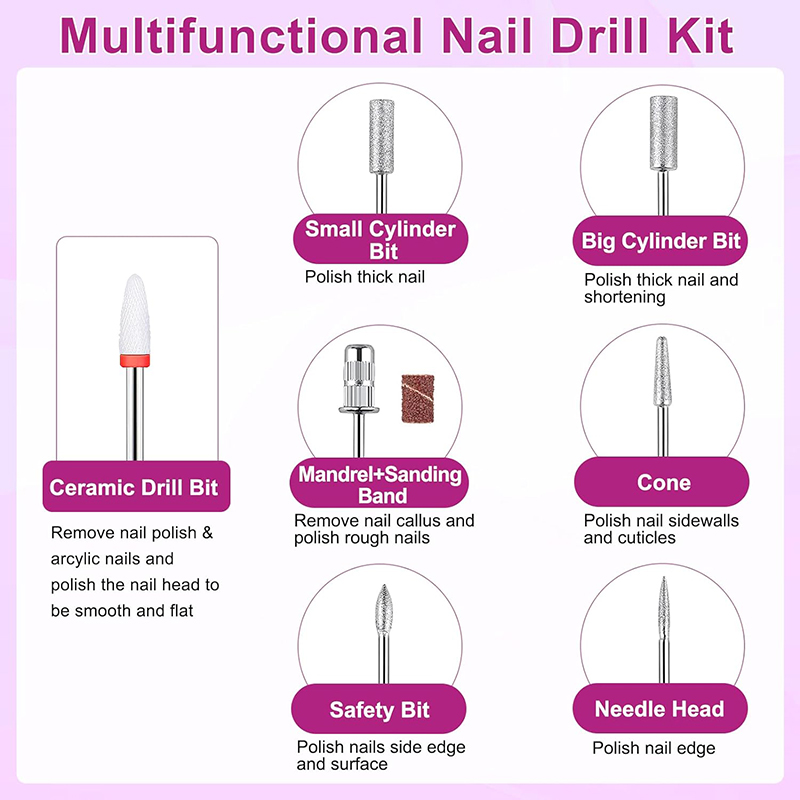 تشتمل آلة مثقاب الأظافر على 6 رؤوس مثقاب أظافر من الفولاذ المقاوم للصدأ، وقطعة مثقاب من السيراميك و36 شريط صنفرة قابل للتبديل. يمكن استخدام مجموعة المانيكير والباديكير في عمليات تجميل الأظافر والباديكير والتلميع والتشكيل وطحن الجلد وإزالة الأظافر الأكريليك/الجل أو لتجميل الأظافر. كاملة مع الملحقات وسهلة الاستخدام، مثالية للمبتدئين في فن الأظافر!