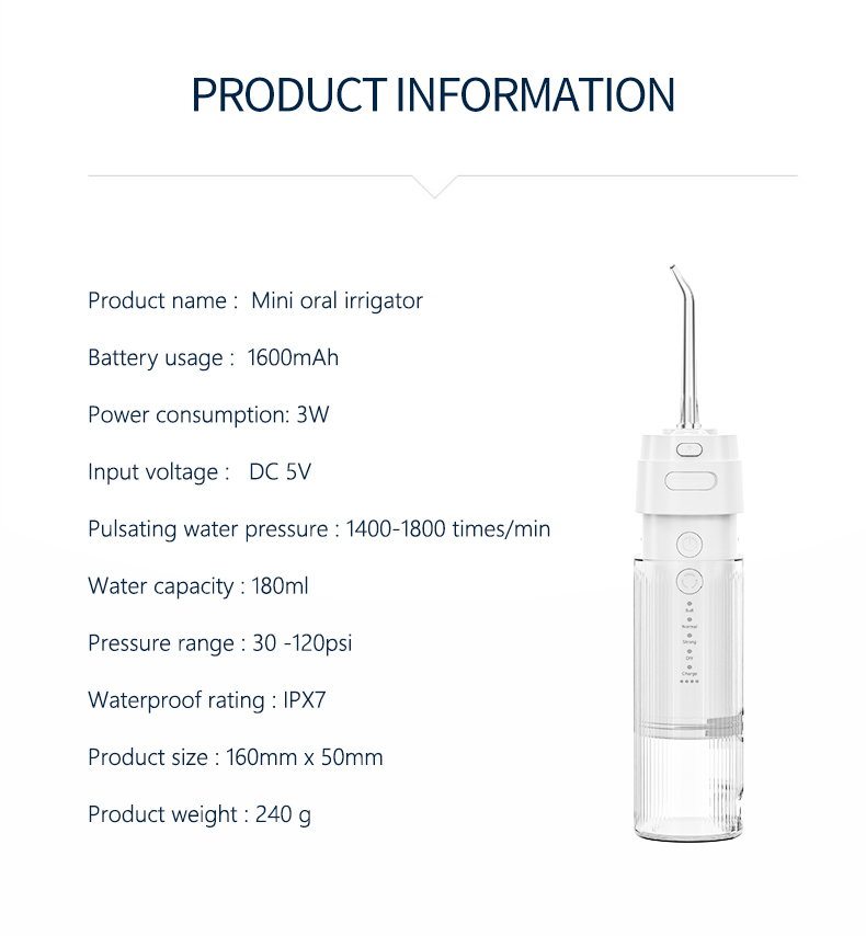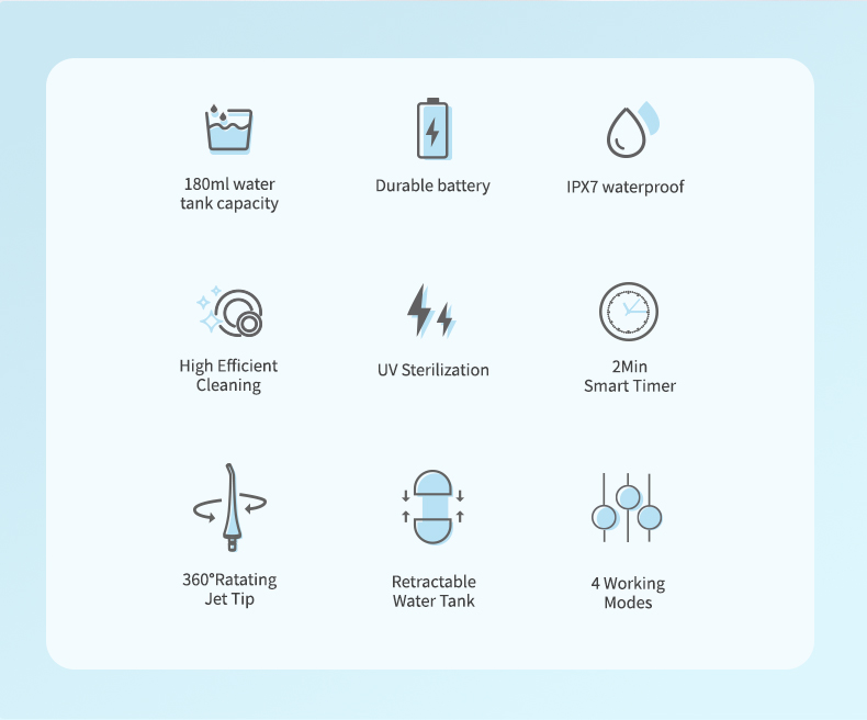 يوفر خيط تنظيف الأسنان المائي هذا نبضات عالية الضغط من الماء بمعدل 1400-1800 مرة في الدقيقة، مما يزيل بفعالية 99.9% من البلاك من أجل تنظيف الأسنان بعمق. يعمل خيط تنظيف الأسنان المائي هذا على تدليك اللثة، وتعزيز الدورة الدموية، ومعالجة مشاكل الفم مثل رائحة الفم الكريهة، والأسنان التقويمية.