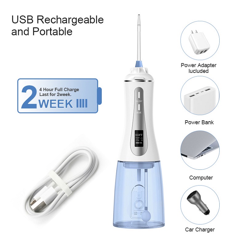 يتميز جهاز تنظيف الأسنان المائي هذا بضعف عمر بطارية الأجهزة الأخرى بفضل بطارية قوية صديقة للبيئة. ما عليك سوى الشحن لمدة 3 ساعات والاستمتاع بـ 30 يومًا من الاستخدام. إنه صغير الحجم وخفيف الوزن، ومثالي للاستخدام المنزلي وأثناء التنقل. يأتي جهاز تنظيف الأسنان المائي هذا مزودًا بكابل USB (المحول غير متضمن) مما يجعله مجموعة سفر مثالية. استفد من عمر البطارية الطويل بشكل استثنائي الذي يصل إلى 30 يومًا، مما يجعله حلاً محمولاً حقًا لراحتك