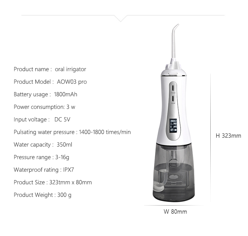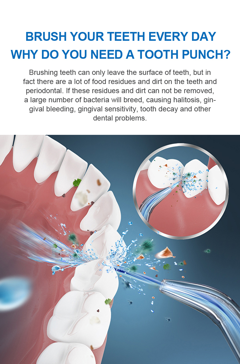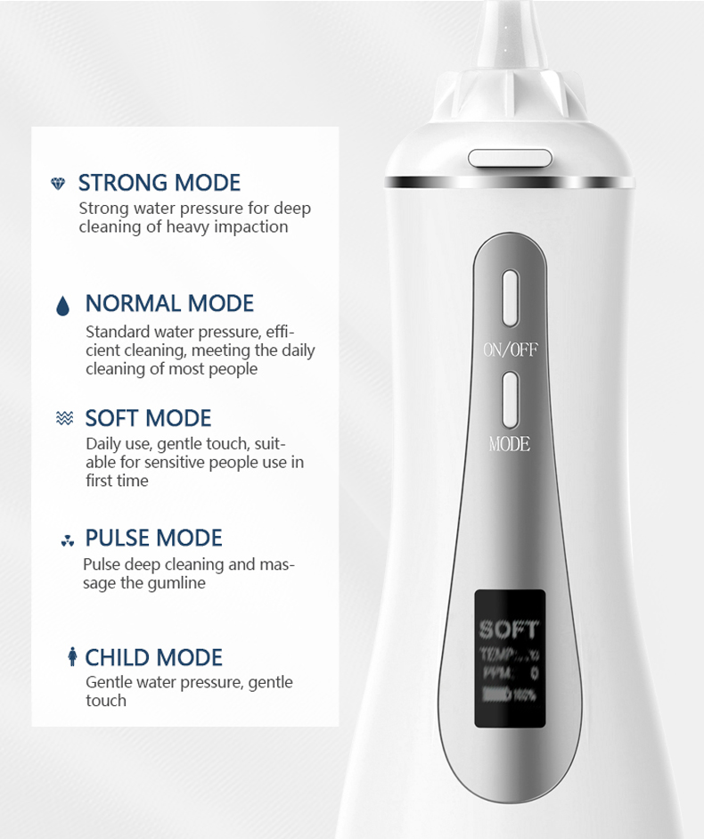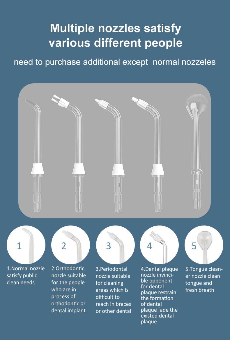 توفر أداة تنظيف الأسنان المائية هذه نبضات ضغط مياه عالية بمعدل 1400-1800 مرة في الدقيقة، مما يزيل بشكل فعال 99.9% من لوحة الأسنان لتنظيف الأسنان بعمق. تعمل أداة تنظيف الأسنان المائية هذه على تدليك اللثة وتعزيز الدورة الدموية ومعالجة مشاكل الفم مثل رائحة الفم الكريهة وتقويم الأسنان.