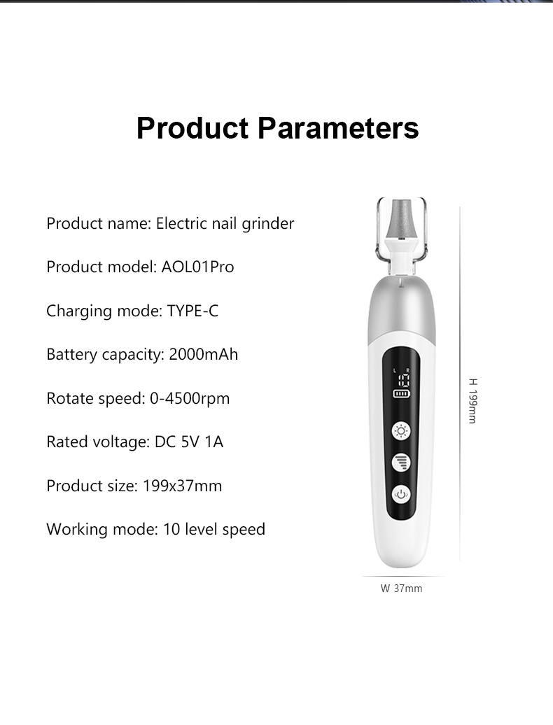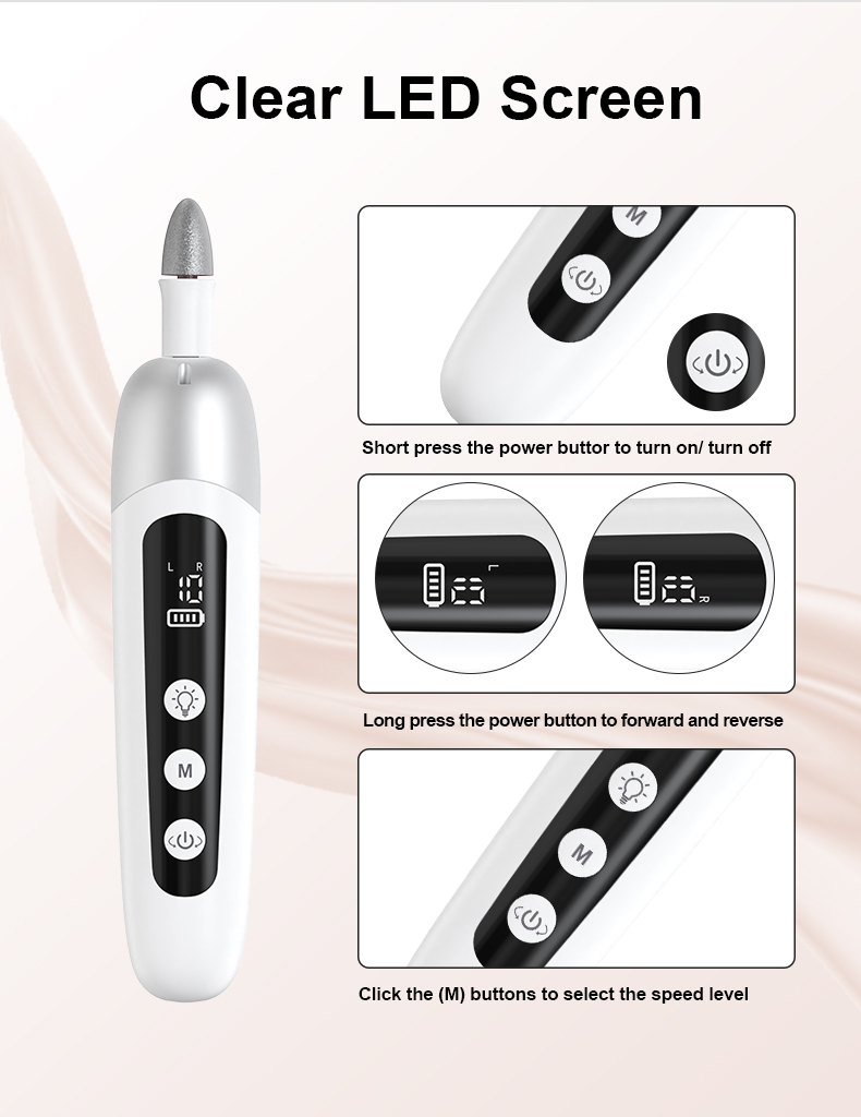 - شاشة LED مبتكرة: يمكنك التنقل بسلاسة بين الإعدادات المطلوبة بسهولة. تشير شاشة LED إلى حالة البطارية وتفضيلات السرعة وإعدادات الدوران لتشغيل سهل. كما تم تجهيز ماكينة برد الأظافر الكهربائية بمصباح LED مدمج يضيء مناطق اليدين والقدمين